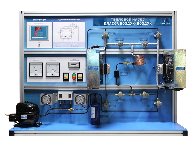 Учебное оборудование позволяет изучить основные компоненты теплового насоса типа воздух-воздух, с регистрацией данных о хладагенте, и принцип их работы.