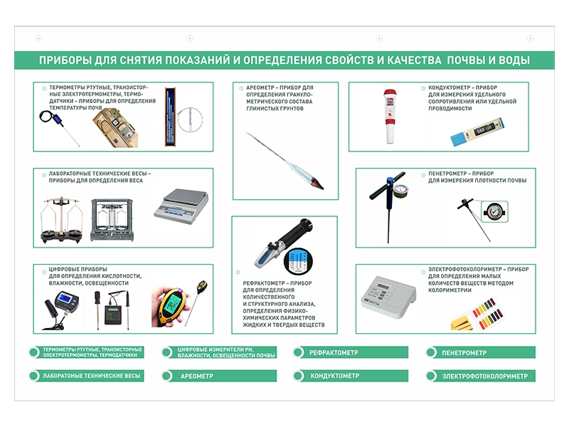 - Приборы для снятия показаний и определения свойств и качества почвы и воды.