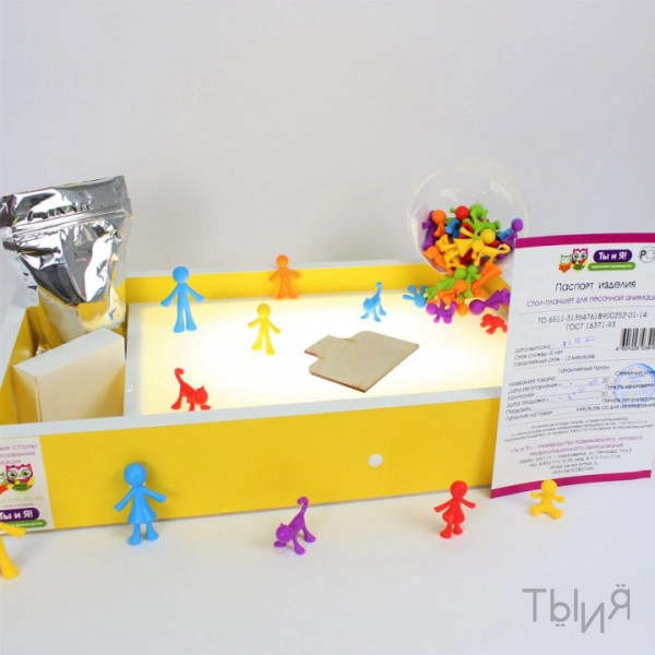 Световой-планшет, песок, подсветка, яркий корпус, отсек для инструментов и песка.