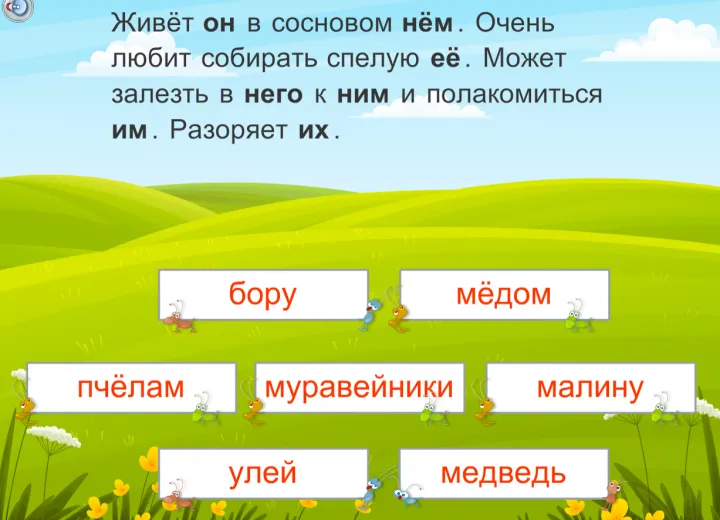 На экране появляются предложения, в которых существительные заменены местоимениями. Необходимо выбрать у жучков существительные, соответствующие смыслу текста, и произвести замену, перетащив слово на местоимение
