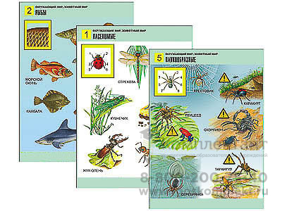 Таблицы: 1. Насекомые. 2. Рыбы. 3. Птицы. 4. Звери. 5. Паукообразные. 6. Земноводные и пресмыкающиеся. 7. Птицы перелетные, оседлые и кочующие. 8. Животноводство.