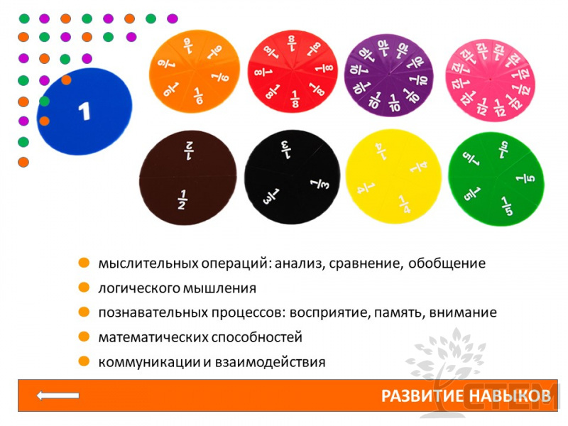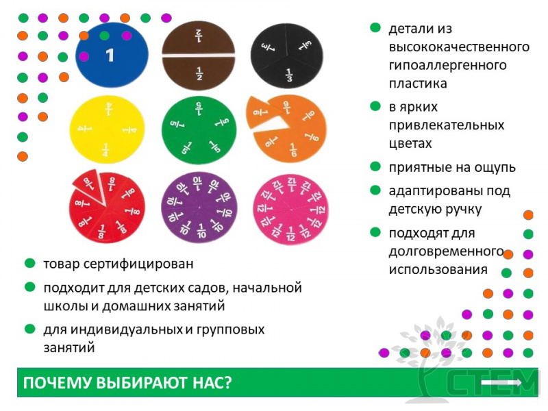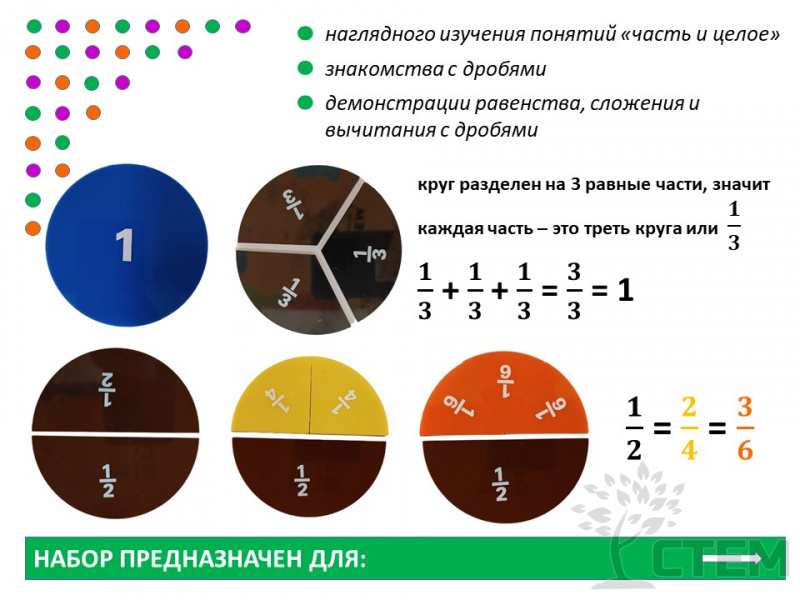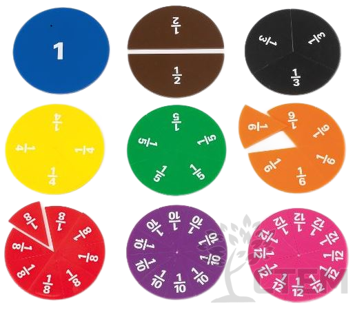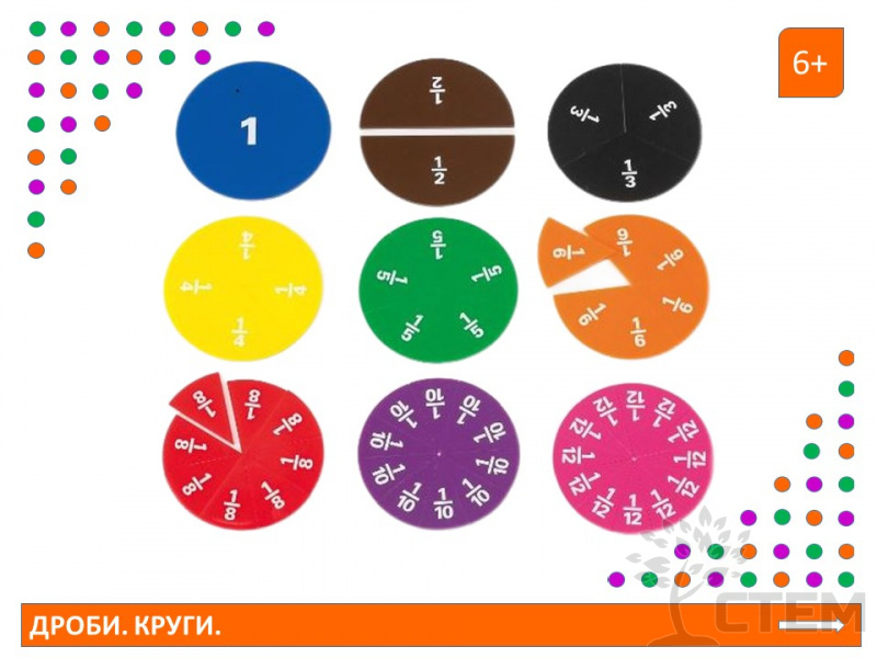 Набор «Круги. Дроби» предназначен для наглядного изучения понятий: "часть" и "целое", для знакомства с дробями.