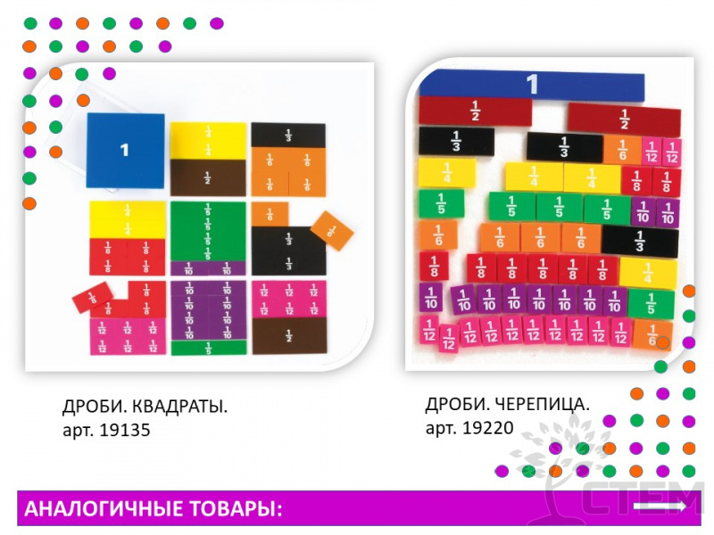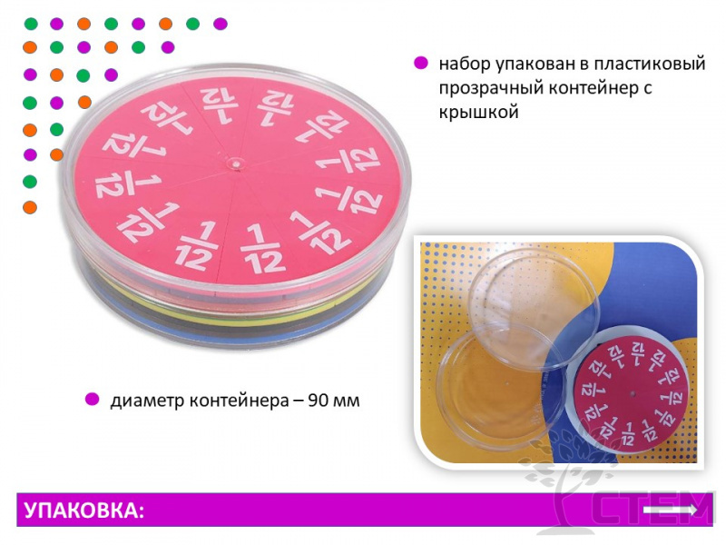 Набор из 51 пропорциональных секторов круга, маркированных по его долям и демонстрирующих целые и половинные значения, третьи, четвертые, пятые, шестые, восьмые, десятые и двенадцатые части, в 9 ярких цветах, напечатанные на каждом круге. Диаметр круга – 87 мм.